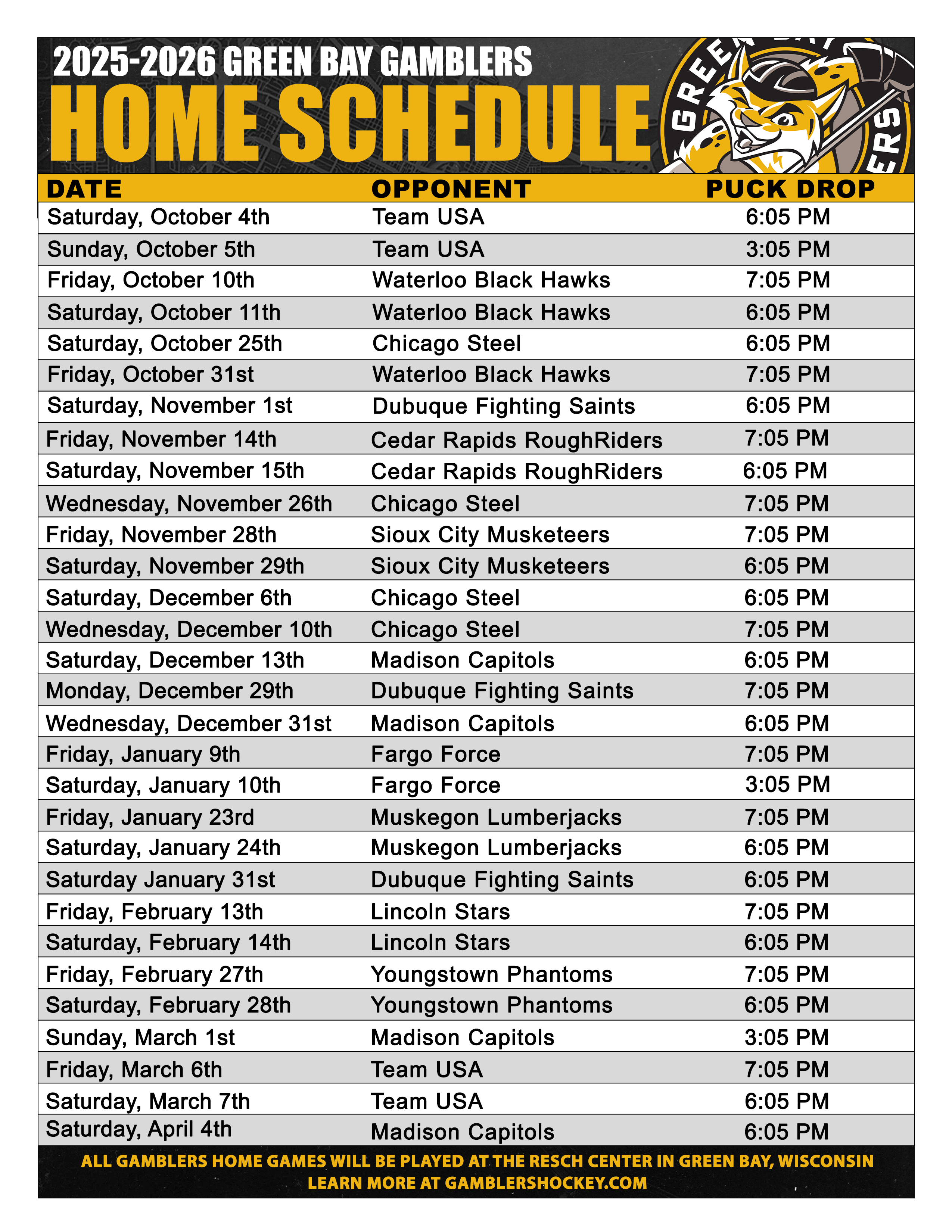 The Gamblers will return to the Resch Center on Wednesday, Nov. 26, to face off against the Chicago Steel for Bud Night and Whiteout Night at 7:05 p.m.